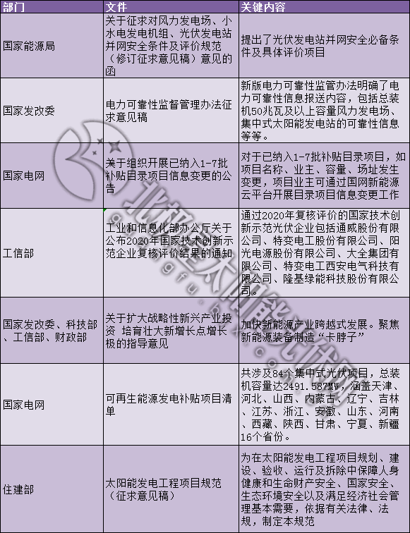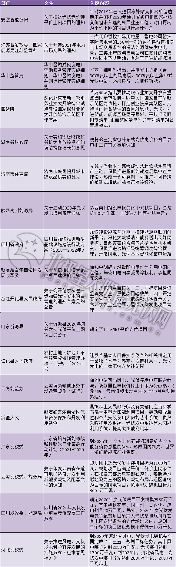 月底,河北、四川、云南和广东四省密集出台了新能源规划的战略性政策文件,为十四五规划打了前哨,其中:云南2020-2021年规划建设3GW光伏发电项目;河北规划至2025年新增装机3GW;广东“十四五”期间规划风电、光伏、生物质新增2.9GW;四川省2020年确定2020年度光伏项目开发规模为80万千瓦,另外有消息称,四川“三州一市”光伏基地十四五规划总装机容量预计20GW。